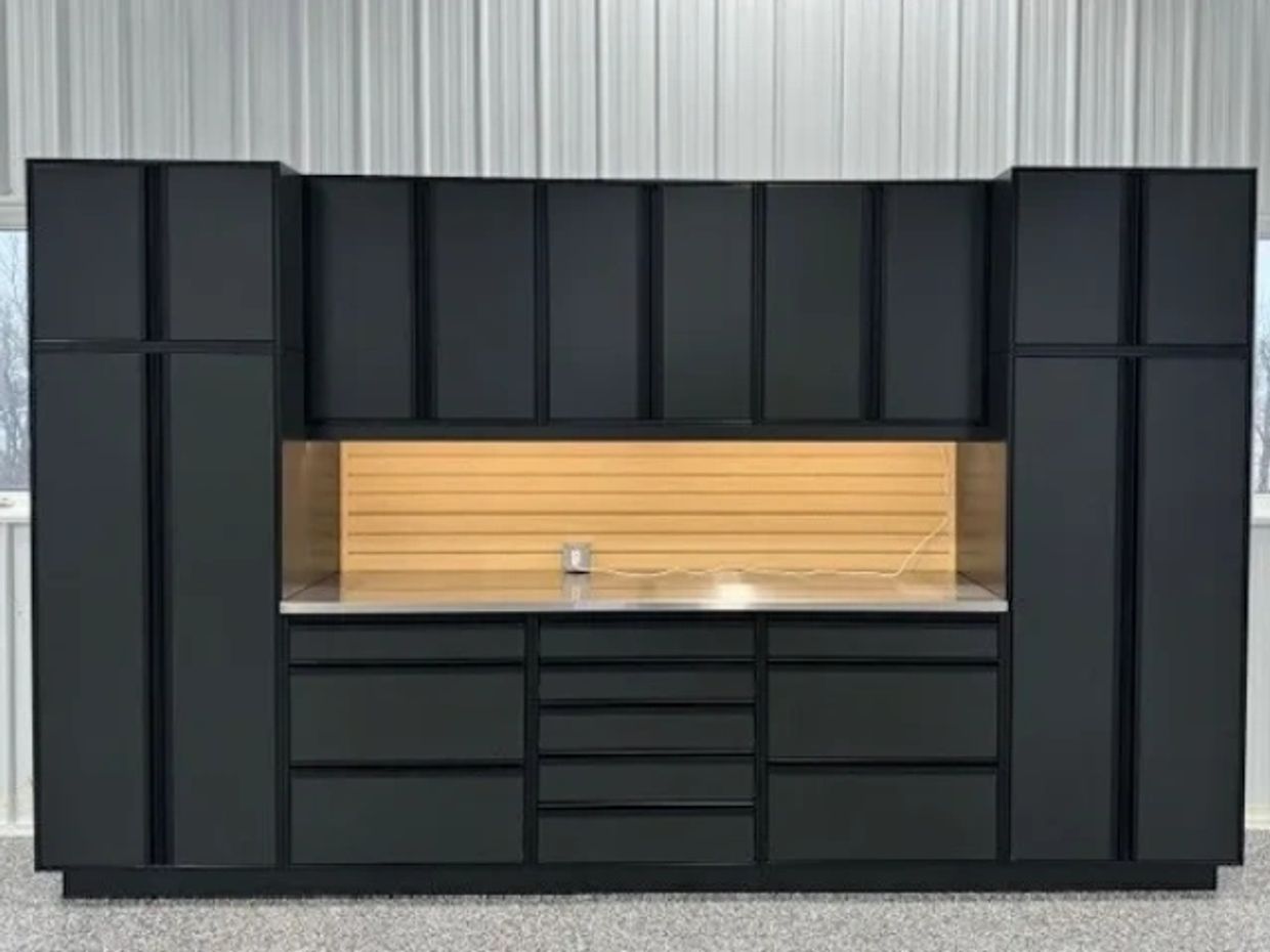 Elevate your space with Baldhead's premium cabinets—crafted to perfection with unmatched quality and attention to detail. Made from durable 18 gauge cold rolled steel, these cabinets are built to last, from raw sheet to powder coating and assembly. Featuring double wall metal construction, self-closing European door hinges, and magnetic door catches, Baldhead cabinets offer both functionality and elegance. With true full extension drawers boasting a 150 lb. capacity and non-slip liners, organizing your tools and belongings has never been easier. Plus, our cabinets come equipped with leveling legs and optional kick plate enclosure for added convenience. Illuminate your workspace with optional GFI outlet and fluorescent light bars under upper cabinets, ensuring every task is completed with precision. Ready to transform your space with the highest quality cabinets? Choose Baldhead for superior craftsmanship and style that stands the test of time.